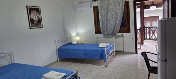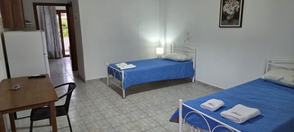 Апартманот располага со кујна ,една спална, купатило со WC и тераса со маса и столици со страничен поглед на море. Во кујната има два поединечни кревети,тв,клима уред и кујната е комплетно опремена со кујнски инвентар ,аспиратор,голем фрижидер,ел.шпорет со рерна. Во спалната соба има еден дупол кревет со натказни.Од кујната се излегува на тераса со маса и столици со страничен поглед на море.И од спалната се озлегува на тераса со маса и столици. Во ходникот има плакар за алишта. Апартманот е опрмен на сите прозори со комарници.