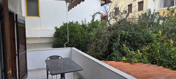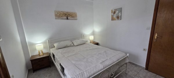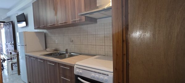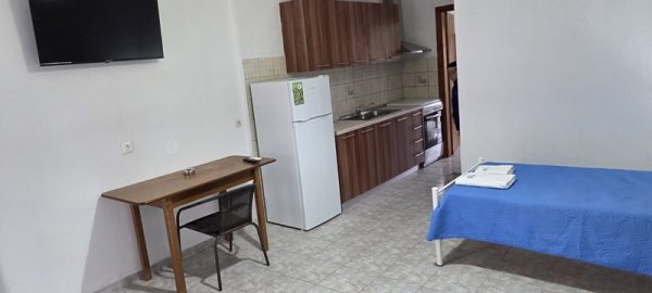 Апартманот располага со кујна ,една спална, купатило со WC и тераса со маса и столици со страничен поглед на море. Во кујната има два поединечни кревети,тв,клима уред и кујната е комплетно опремена со кујнски инвентар ,аспиратор,голем фрижидер,ел.шпорет со рерна. Во спалната соба има еден дупол кревет со натказни.Од кујната се излегува на тераса со маса и столици со страничен поглед на море. Во ходникот има плакар за алишта. Апартманот е опрмен на сите прозори со комарници.